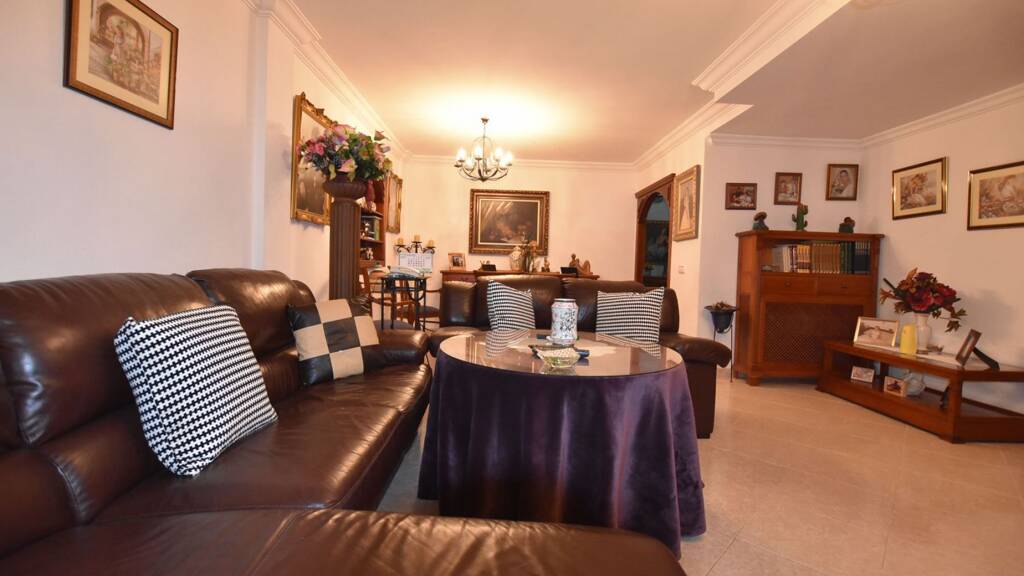 Aufgeteilt in ein großes Wohnzimmer, drei Doppelschlafzimmer mit Einbauschränken, zwei Badezimmer, Küche, Waschküche, eine grosse Terrasse, private Garage auf Strassenniveau.