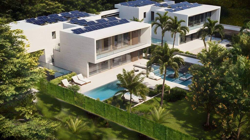 Das Erdgeschoss öffnet sich zum Garten durch ein großes Wohnzimmer und Esszimmer mit integrierter Designerküche, die voll ausgestattet ist und mit dem Außenbereich verbunden ist. Große, vollhohe Fenster ermöglichen eine perfekte Verbindung zwischen Innen- und Außenbereich und führen zur überdachten Veranda, dem privaten Pool und dem Chill-out-Bereich. Auf dieser Ebene gibt es außerdem ein Gästezimmer mit eigenem Bad und einer Gästetoilette.