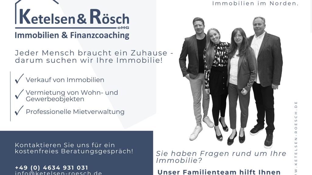 Haben wir Ihr Interesse geweckt, dann fordern Sie ein Exposé an auf: www.ketelsen-roesch.de oder rufen Sie uns an.