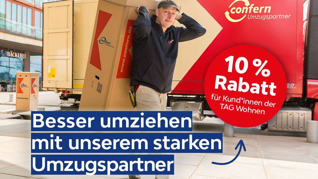 Finden Sie Ihr neues Zuhause unter www.tag-wohnen.de und vereinbaren Sie Ihren persönlichen Besichtigungstermin. Wir freuen uns auf Ihre Anfrage. Profitieren Sie als TAG Wohnen-Mieter von unseren Partnerangeboten und sichern Sie sich viele Sonderrabatte und günstige Konditionen u.a. in den Bereichen Unterhaltung, Umzug, Ernährung und Mobilität. Strom und Gas von lekker Energie - Sichern Sie sich Ihren exklusiven TAG Wohnen-Bonus unter www.lekker.de/kunden/tag-wohnen Sichern Sie sich zudem einen entspannten Umzug mit unserem Partner Transporo und einem 10% Rabatt über folgenden Link: www.transporo.de/tag Alle Angaben in diesem Exposé wurden sorgfältig getätigt. Fehlerhafte Angaben können nicht ausgeschlossen werden, daher sind die Angaben ohne Gewähr. Maßgeblich sind die im Mietvertrag geschlossenen Vereinbarungen.