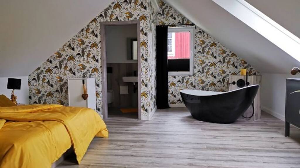 Die Wohnung ist ca. 100 qm groß. Der offene Wohn- und Küchenbereich, sowie ein Bad und der Hauswirtschaftsraum befinden sich im unteren Geschoss. Das Schlafzimmer mit freistehender Badewanne, ein Bad und ein Schrankzimmer sind im Obergeschoss, im sanierten Teil des Hauses.