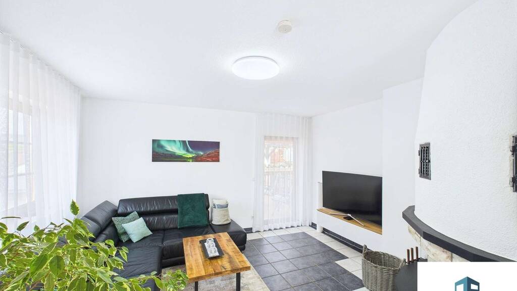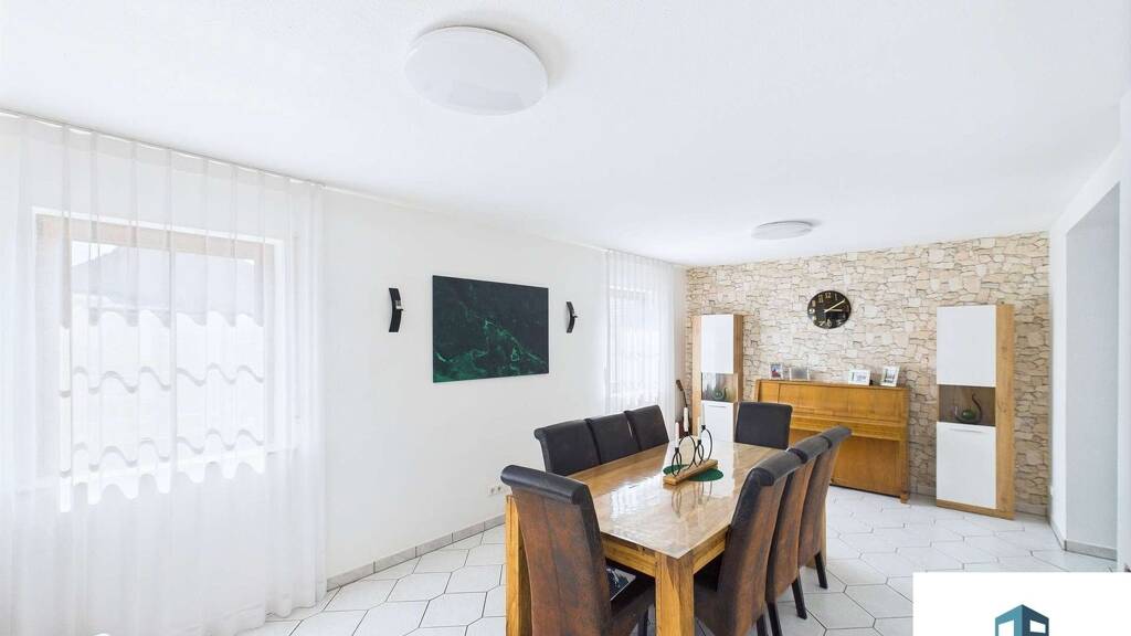 Im 1. Obergeschoss erstreckt sich die rund 100 m² große Einliegerwohnung über die gesamte Etage. Sie umfasst ein helles Wohnzimmer mit Zugang zur großen Terrasse, eine geräumige Küche mit einem angrenzenden Esszimmer, zwei Schlafzimmer sowie ein Badezimmer. Zusätzlich stehen ein Gäste-WC und ein praktischer Abstellraum zur Verfügung.