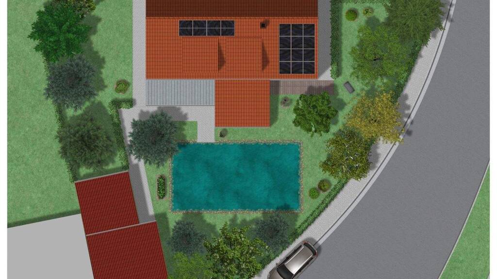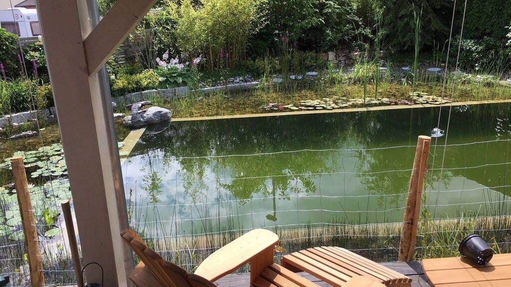 * Der Wellness-Garten: Ein natürlicher Schwimmteich (mit Poolfilteranlage, chemikalienfrei) bildet das Herzstück, flankiert von einer großen überdachten Terrasse und einem vollständig ausgestatteten Saunahaus mit eigenem Bad und Ruheraum. Eine Zisterne (3.000 l) zur Gartenbewässerung ist vorhanden.
