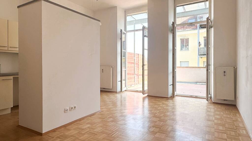 DAS BESONDERE AN DIESER WOHNUNG IST DIE KOMBINATION AUS LAGE UND DER GROSSEN, TEILS ÜBERDACHTEN TERRASSE MIT CA. 16 M² - ERGÄNZT DURCH RAUMHOHE FENSTERTÜREN UND EINE BEEINDRUCKENDE RAUMHÖHE VON CA. 3,55 M IM WOHN-, KOCH- UND ESSBEREICH, VORRAUM UND BAD.