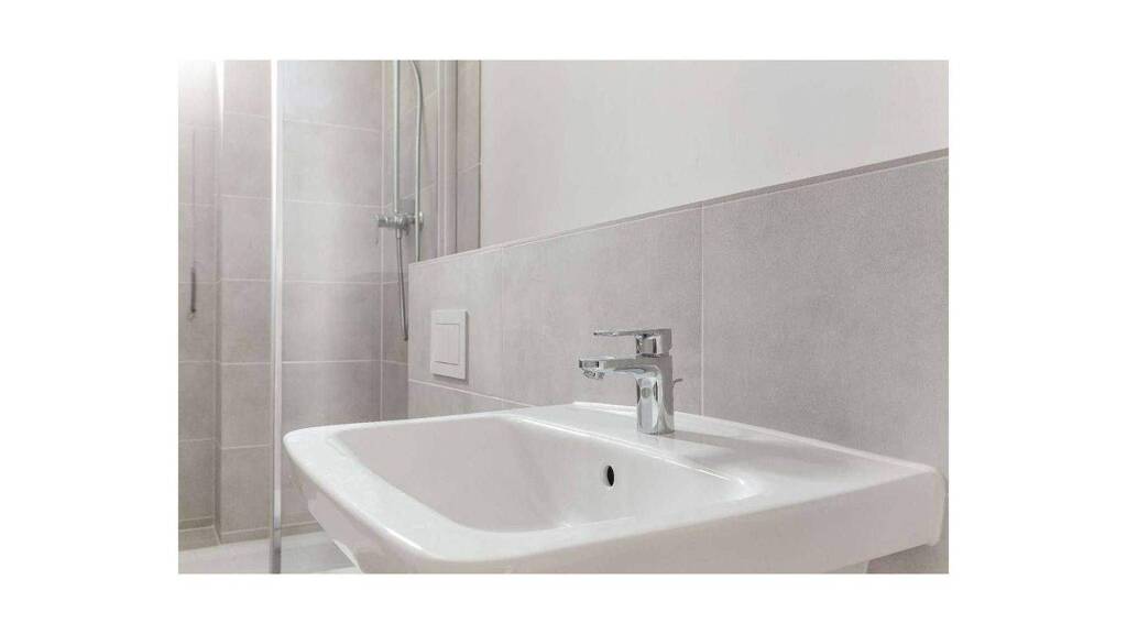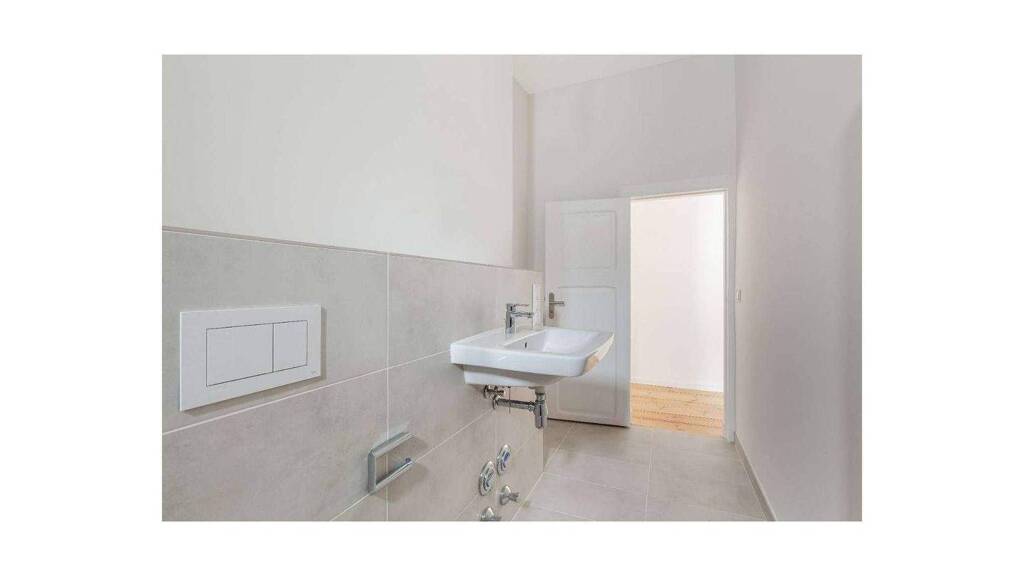 Das Badezimmer der Wohnung ist modern und elegant gestaltet. Es verfügt über eine Badewanne, ein Waschbecken und ein WC. Die hochwertigen Armaturen und Fliesen verleihen dem Raum einen zeitlosen Charme und bieten Ihnen einen Ort zum Entspannen.