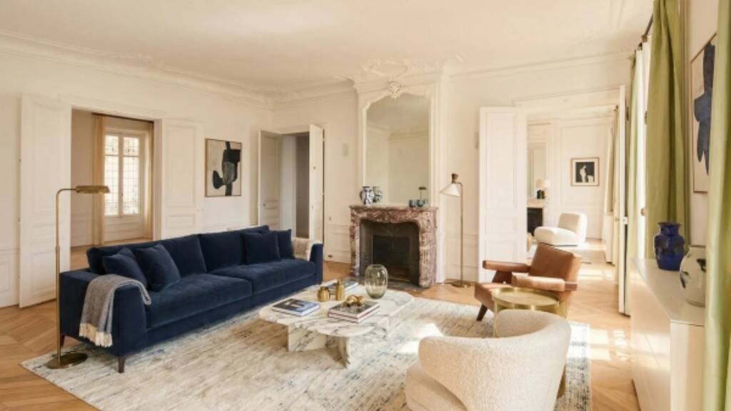 Large living room with fireplace and a view over the Jardin des Tuileries