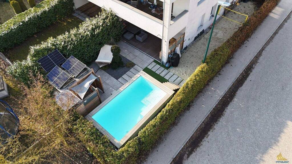 Direkt vom Wohnzimmer aus gelangt man auf die ca. 20 m² große, überdachte Terrasse, die zusätzlichen Wohnraum im Freien schafft und sich ideal für entspannte Stunden eignet. Im Garten wurde ein Salzwasserpool mit ca. 6 × 3 Metern errichtet mit PH-Wert Regelung und eigener Wärmepumpe. Ein weiteres Plus ist das Gartenhaus mit integrierter Sauna und Außendusche, das für zusätzlichen Komfort sorgt. Am Dach des Gartenhauses wurde ein PV Balkonkraftwerk errichtet welches für geringere Stromkosten sorgt. Der restliche Gartenbereich wurde als Sandfläche bzw. Beachvolleyballbereich gestaltet und bietet vielseitige Nutzungsmöglichkeiten.