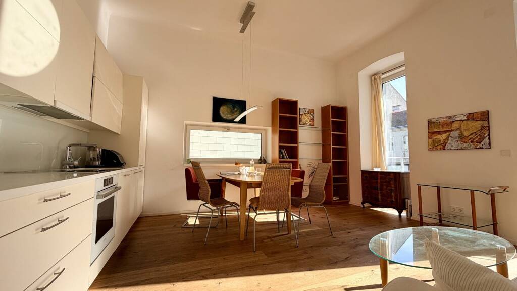 Ein luxuriöses Badezimmer mit Wanne, Dusche und Fenster, eine stilvolle, voll ausgestattete Einbauküche sowie durchdachte Stauraumlösungen runden das Angebot perfekt ab.