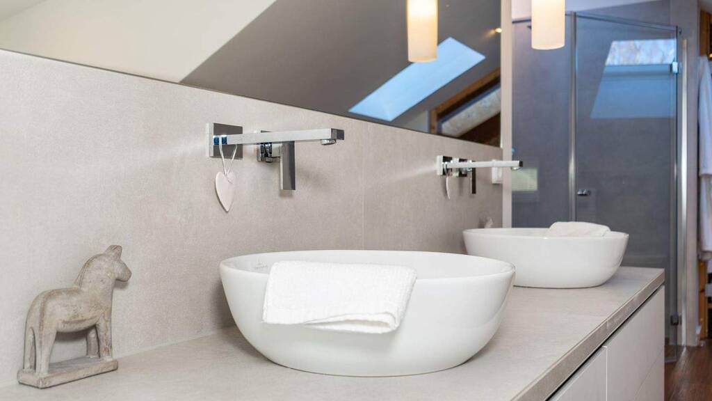 Das Master-Schlafzimmer ist als Ruhepol konzipiert. Ein durchdachtes Trennelement schafft den Übergang zum privaten Badbereich, der mit einer runden Steingut-Badewanne in einer hellen Gaube sowie einer XL-Dusche ausgestattet ist. Ein besonderes Highlight für die kühleren Tage ist die integrierte Zwei-Personen-Sauna aus feinstem Abachi-Holz. Hinter der ästhetischen Fassade steckt eine hochmoderne Infrastruktur. Mit der Energieeffizienzklasse A/A+ und einer effizienten Wärmepumpentechnik bietet das Objekt nicht nur niedrige Betriebskosten, sondern auch ein nachhaltiges Heizkonzept über die Fußbodenheizung.