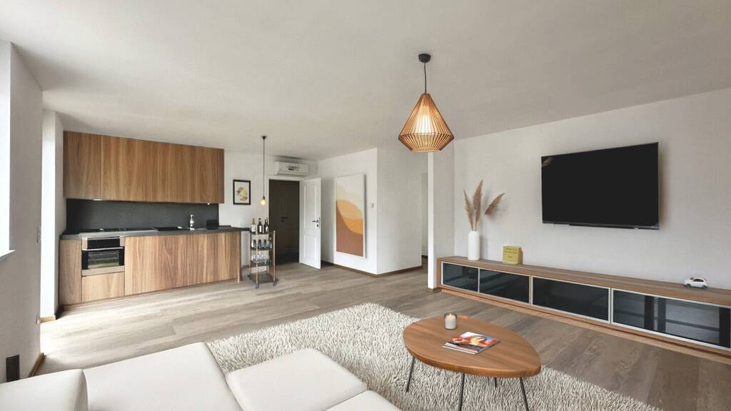 * Vorraum * Offene Wohnküche mit Zugang zum Balkon (ca. 5 m², Richtung Innenhof) * Flur mit Abstellraum * Zwei geräumige Schlafzimmer * Kleines Badezimmer mit Dusche * Großes Schlafzimmer mit eigenem Balkon und en-suite Badezimmer (mit Dusche & Badewanne) * Separates WC