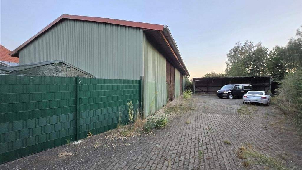 HALLE / LAGER - ca. 240 m² Nutzfläche (ca. 10 m x ca. 24 m, bis zu ca. 4,50 m Deckenhöhe bis zum Balken) - 2 Tore - Büro / Innenraum in der Halle - Stromanschluss und Starkstromsnschluss vorhanden - Leichtbauhalle mit beschichtetem Wellenblech