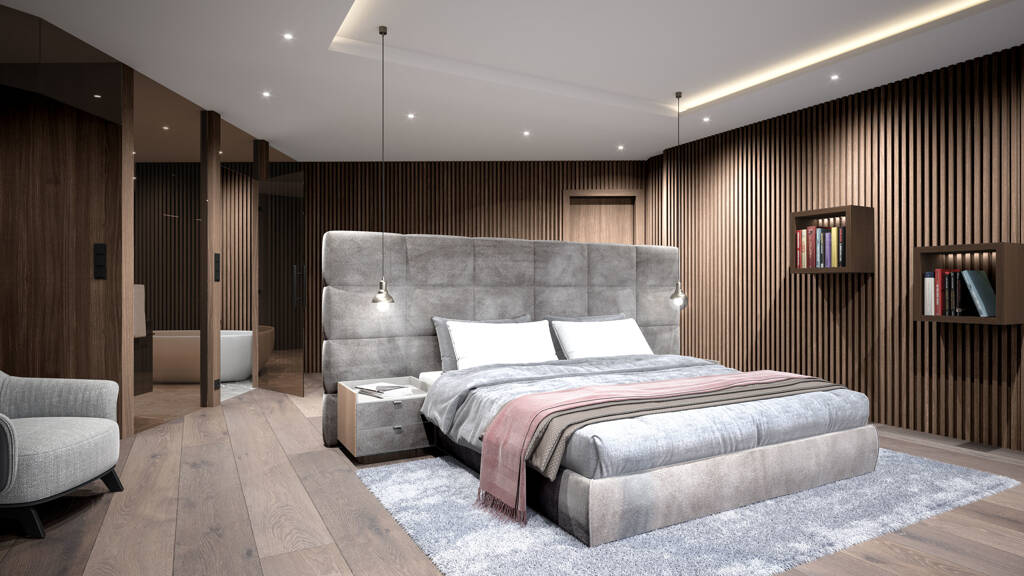 Im Gartengeschoss ist der Masterbereich mit Ankleide, Masterbad und separatem WC untergebracht. Vom Masterbereich gelangen Sie in den schön angelegten Garten. Weiters befindet sich auf dieser Ebene ein zusätzliches großzügiges Schlafzimmer mit integriertem Wellnessbereich mit Sauna und Dusche.