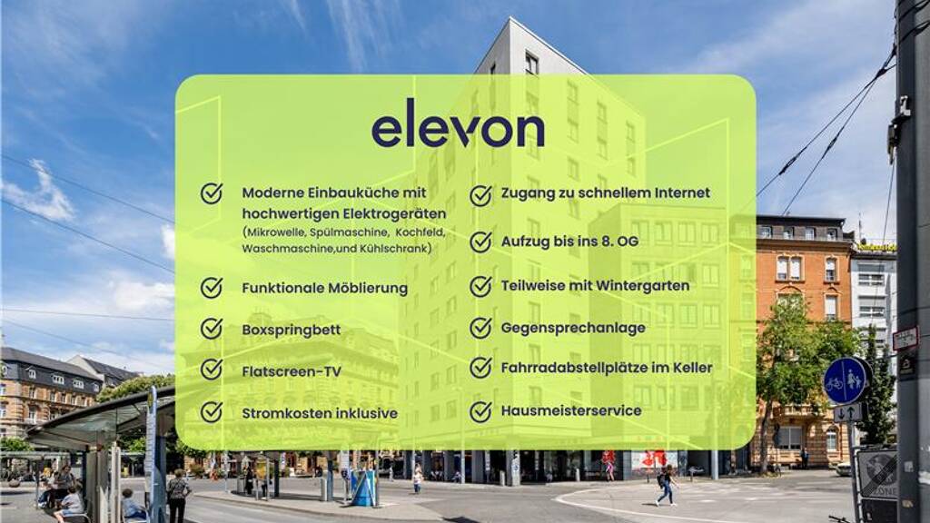 Alle Besonderheiten des 2016 sanierten Apartmenthauses auf einen Blick: - Linoleumboden in dem Wohnbereich - Fliesenboden im Duschbad mit hochwertigen Armaturen - Zugang zu schnellem drahtlosem Internet - Stromkosten inklusive - keine zusätzliche Kosten für den Stromverbrauch - Moderne, offene Küchenzeile mit hochwertigen Elektrogeräten (Kochfeld, Kühlschrank, Mikrowellenkombination, Spülmaschine und Waschmaschine) - Heller Wohnbereich mit funktionalen Möbeln (Boxspringbett, Schrank, Sessel, Tisch mit Stühlen, Flatscreen-TV, Beleuchtung) - Aufzug bis in das 8. Obergeschoss - Teilweise mit Wintergarten - Gegensprechanlage - Fahrradabstellplätze im Keller - Hausmeisterservice