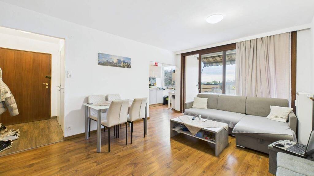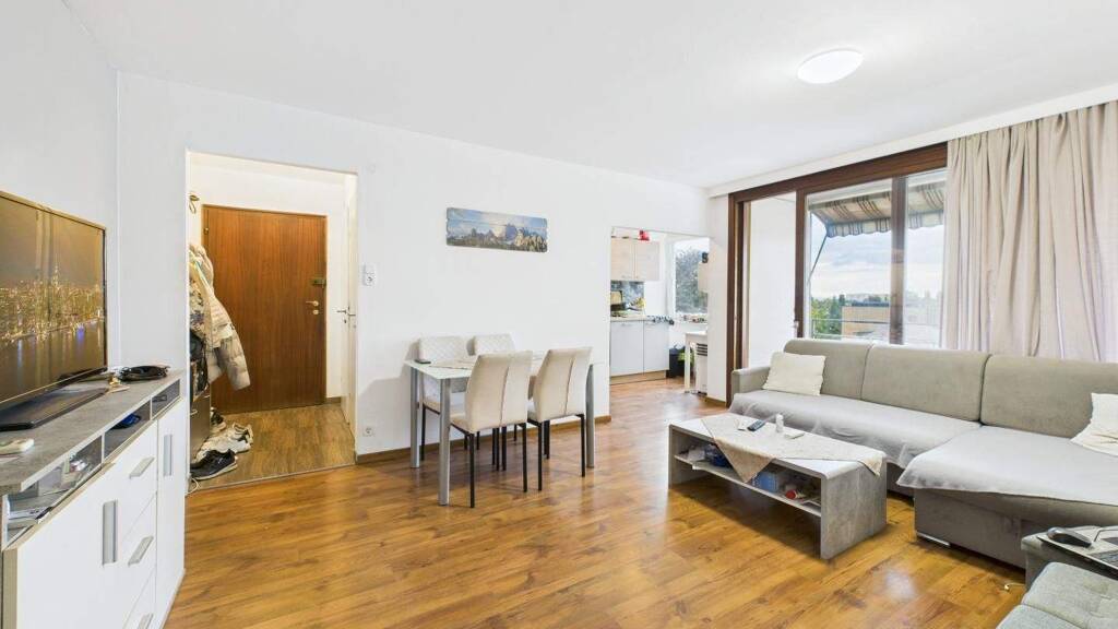 Der zentrale Wohnbereich bildet das Herzstück der Wohnung und bietet ein offenes, lichtdurchflutetes Wohngefühl. Von hier aus gelangt man direkt auf die Loggia, die den Wohnraum angenehm erweitert und Platz für entspannte Stunden im Freien schafft.