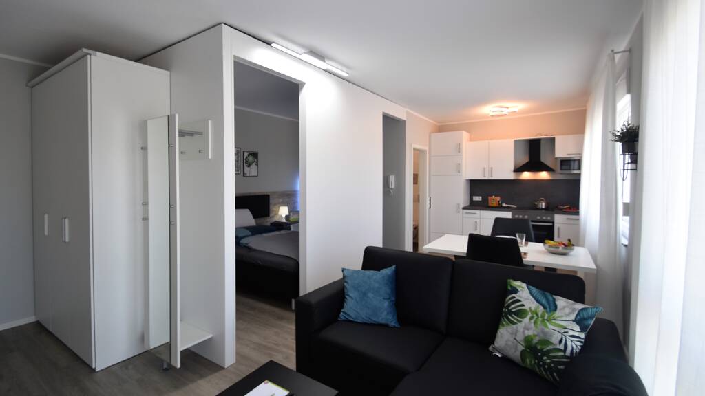 Modernes 2-Zimmer-Apartment komplett ausgestattet für Single oder Pärchen mit vorübergehendem Wohnbedarf. Buchungszeiten flexibel verlängerbar, Pauschalpreis, keine versteckten Kosten.