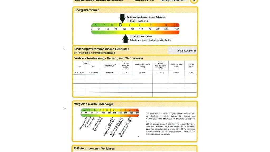Kennziffern zum Energieausweis: Verbrauchsausweis von 2017, gültig bis 05.04.2027, Kennwert 94,2 kWh/(m²-a), Gasheizung von 1997, Energieeffizienzklasse C