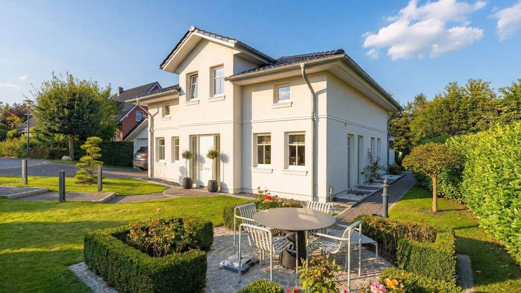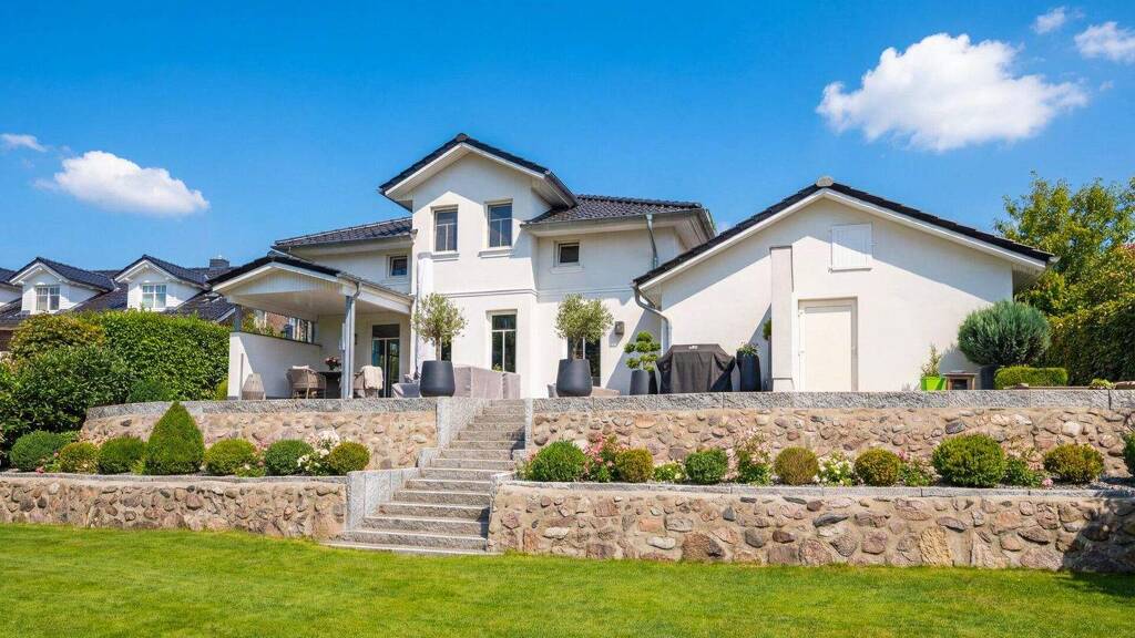 In einer ruhigen Wohnstraße von Glücksburg, am Ende einer Sackgasse gelegen, befindet sich dieses sehr gepflegte Einfamilienhaus im Stil einer Stadtvilla. Die klare Architektur mit weißer Fassade und dunklem Walmdach wirkt elegant und zeitlos und fügt sich stimmig in das großzügige Grundstück mit einer Fläche von über 1.000 m² ein.