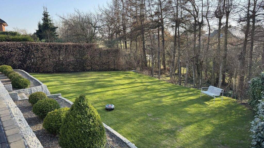 Allein das Grundstück überzeugt durch seine Uneinsehbarkeit, sonnige Lage und grüne Einfriedung. Die erhöhte Terrasse in Süd-West-Ausrichtung hinter dem Haus ist stets sonnig, windgeschützt und bietet ein hohes Maß an Privatsphäre. Durch die leichte Höhenlage entsteht hier eine besondere Atmosphäre, ähnlich wie die einer Dachterrasse eines Penthouse. Gleichzeitig steht unterhalb der Terrasse eine großzügige, fast waagerechte Rasenfläche zur Verfügung. Der vorhandene Baumbestand im rückwärtigen Grundstücksbereich bildet einen natürlichen Abschluss und schirmt das Grundstück zusätzlich gen den Westwind ab. So entsteht ein durchgehend grüner, geschützter und sonniger Außenbereich.
