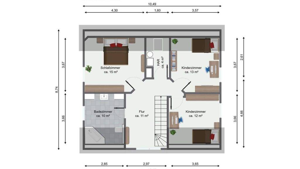 Im Dachgeschoss erwarten Sie zwei helle Schlafzimmer sowie ein weiteres Zimmer, das sich ideal als Büro oder Gästezimmer eignet. Die Räume profitieren von großen Giebelfenstern, die für besonders viel Licht und ein angenehmes Wohngefühl sorgen. Ergänzt wird diese Etage durch ein großzügiges Badezimmer mit Badewanne.