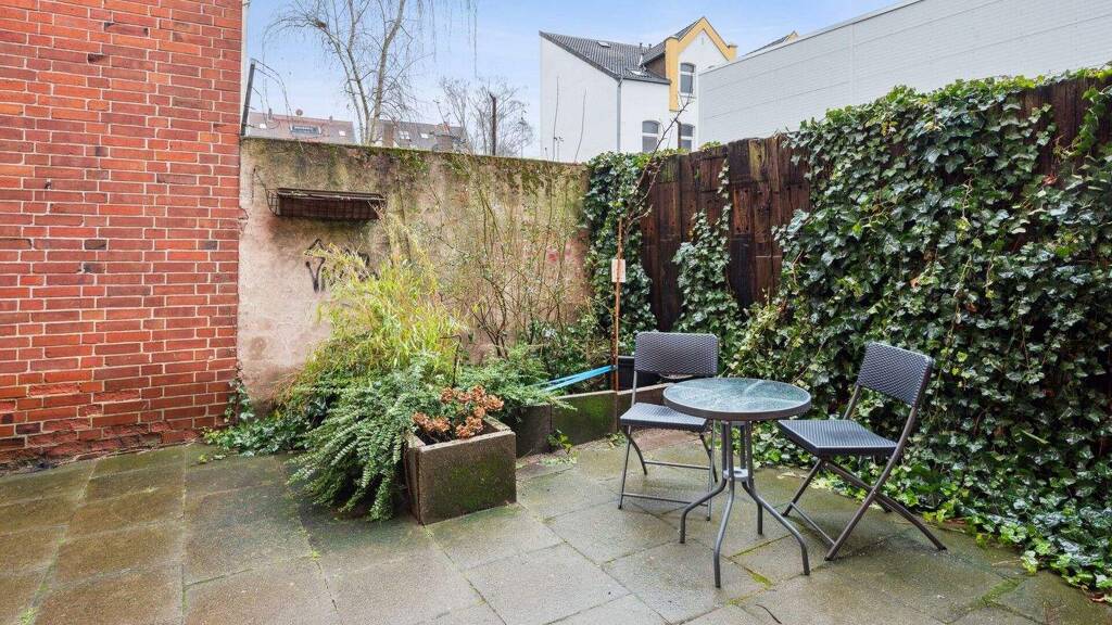 - Ein Fahrradstellplatz und die Mülltonnen befinden sich im abgeschlossenen Hof. Dieser enthält auch einen kleinen Sitzplatz zum Schnacken.
