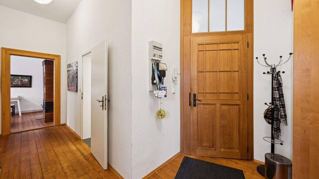Bereits beim Betreten der Wohnung empfängt Sie ein großzügiger Flur, von dem aus alle Räume erreichbar sind. Typische Altbaudetails wie hohe Decken und der charakteristische Dielenboden verleihen den Räumen eine warme und authentische Atmosphäre. Das Wohnzimmer bildet den größten Raum der Wohnung und überzeugt durch seine angenehme Proportion. Ein historischer Kachelofen setzt hier einen besonderen Akzent und unterstreicht den ursprünglichen Charme der Immobilie.