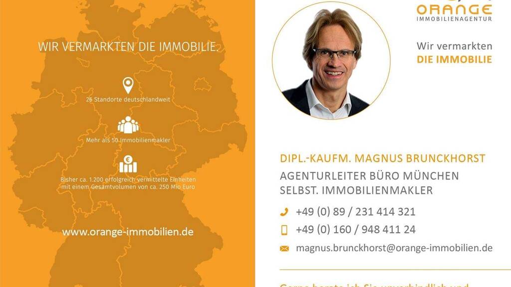 Anfragen über die Immobilienportale werden nur mit vollständiger Adresse und Telefonnummer bearbeitet. Jeder ORANGE Immobilienagentur Kooperationspartner und somit selbständiger Immobilienmakler/in ist ein rechtlich eigenständiges Unternehmen bzw. handelt auf eigene Rechnung/Verantwortung. Aufsichtsbehörde: IHK München und Oberbayern, Max-Joseph-Str. 2, 80333 München.
