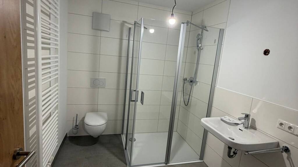 Das moderne Badezimmer ist mit einer bodengleichen Dusche, Waschbecken, WC sowie einem Handtuchheizkörper ausgestattet. Die zeitlosen Fliesen und die klare Gestaltung sorgen für ein modernes und pflegeleichtes Ambiente. Außerdem befindet sich im Bad der Anschluss für eine Waschmaschine.
