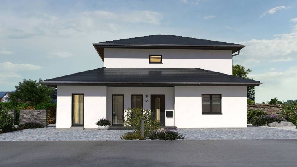 Die Staffelvilla mit Walmdach imponiert mit klarer Struktur. Die reduzierte Formgebung wird architektonisch durch das zweiseitig zurückgestufte Obergeschoss und den Terrassenrücksprung im Erdgeschoss ansprechend ergänzt. Dieser verbindet übergangslos drinnen mit draußen und ist sowohl vom offenen Wohn- als auch vom Essbereich zugänglich. Durch den großzügigen Baustil erhält das Erdgeschoss einen exklusiven Bungalowcharakter. Die halbgewendelte, zentral in den Wohnraum integrierte Treppe führt in die obere Etage. Dort runden der luxuriöse Elternbereich mit Bad en suite, zwei Kinderzimmer sowie ein weiteres Dusch-WC das großzügige Raumangebot ab. OKAL-Standard: ca. 2,80?m Deckenhöhe in beiden Etagen und reichlich Lichteinfall dank bodentiefer Rundum-Verglasung.