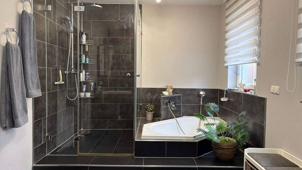 Das hochwertige Tageslichtbad ist eine wahre Wohlfühloase, ausgestattet mit Badewanne, Dusche, zwei Waschtischen, WC sowie einem Bidet. Für angenehmen Wohnkomfort sorgt eine Fußbodenheizung, betrieben über eine Gas-Zentralheizung.