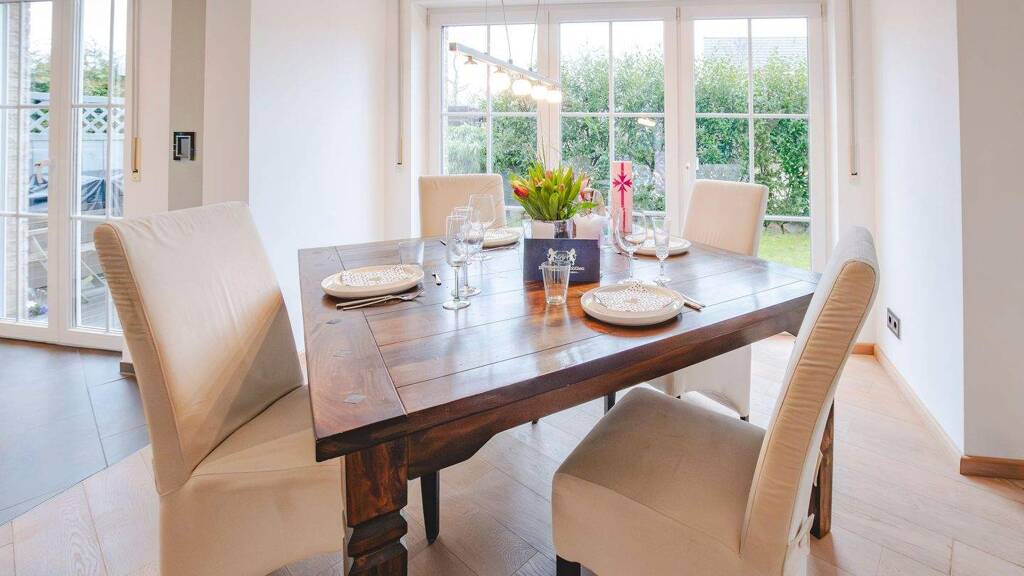 Das Herzstück dieser mediterranen Stadtvilla ist der beeindruckende, lichtdurchflutete Wohn- und Essbereich. Bodentiefe Fenster eröffnen den Blick in den großzügigen Garten und schaffen eine harmonische Verbindung zwischen Innen- und Außenraum.