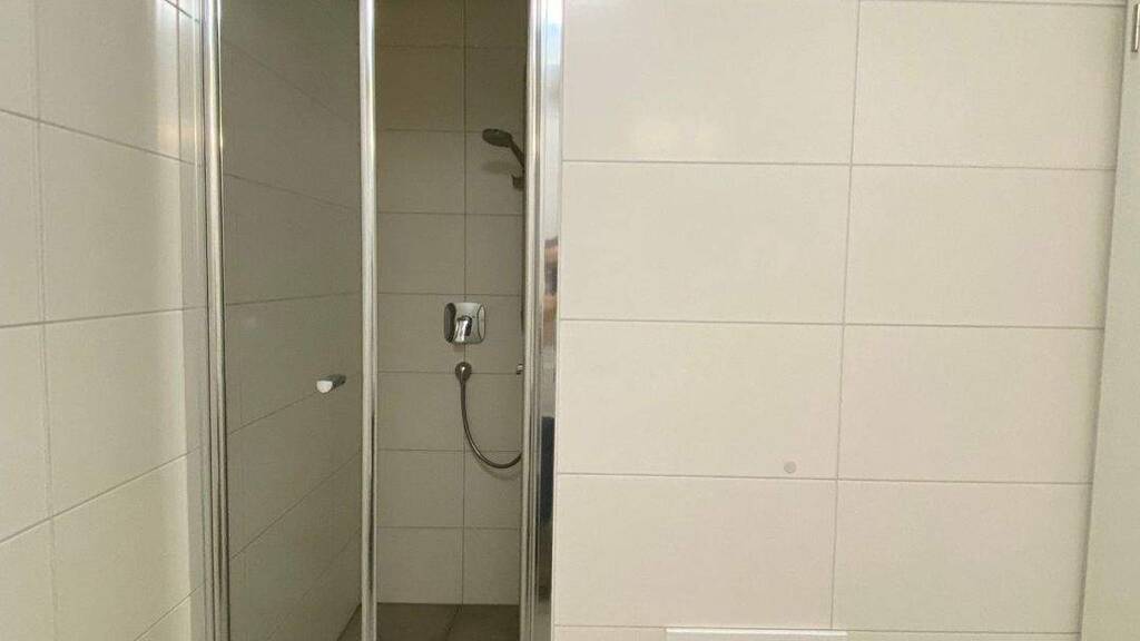 Das Duschbad verfügt über ein Waschbecken, bodenebene Dusche und ein WC.