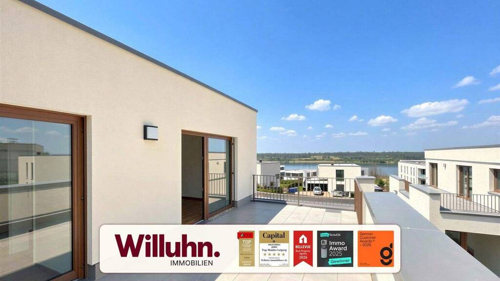 Ein besonderes Highlight befindet sich im Dachgeschoss: Hier liegt das großzügige Masterschlafzimmer mit direktem Zugang zur traumhaften Dachterrasse, von der aus Sie einen seitlichen Blick auf den schönen Zwenkauer See genießen. Ein weiteres Zimmer auf dieser Ebene eignet sich hervorragend als Ankleide oder Homeoffice. Der Hauswirtschaftsraum ergänzt das Angebot.