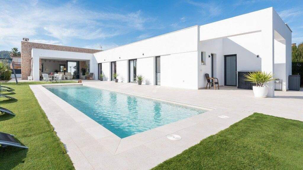 Im Zentrum des Hauses befindet sich ein gro?es Wohnzimmer mit offener K?che, das einen hellen und luftigen Raum schafft, der durch gro?e Glast?ren nahtlos mit dem Au?enbereich verbunden ist. Diese T?ren f?hren direkt zum einladenden Poolbereich, einem idealen Ort zum Entspannen und Genie?en des angenehmen mediterranen Klimas. Angrenzend an die K?che befindet sich ein praktischer Hauswirtschaftsraum, der die Funktionalit?t des Hauses erh?ht.