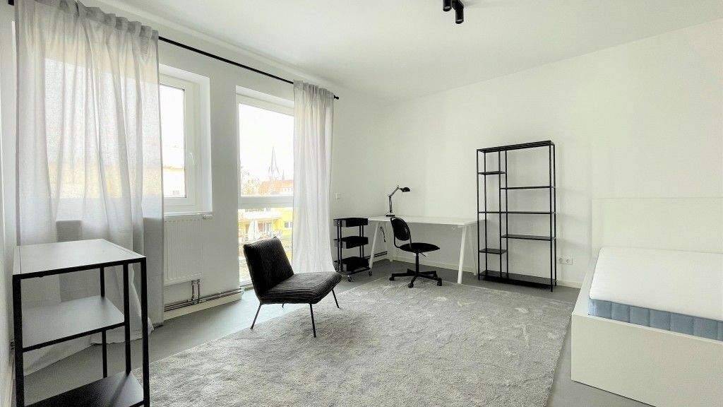 Dieses schicke und lichtdurchflutete WG-Zimmer befindet sich im 2. Obergeschoss eines gepflegten Wohn- und Geschäftshauses und bietet alles, was das Studierendenherz begehrt. Das Zimmer biete eine Wohnfläche von ca. 18 m² und ist bereits vollständig und geschmackvoll möbliert. Hier wurde alles durchdacht und mit Liebe zum Detail geplant: So sind bereits ein Bett, ein Schreibtisch mit Schreibtischstuhl und Lampe, ein Schrank, ein Regal, ein Sessel, eine Kleiderstange und ein Rollwagen vorhanden. Vorhänge komplementieren den Raum und sorgen für eine gemütliche Atmosphäre. Die Küche mit integrierter Lounge sowie das Badezimmer und die separate Toilette sind über den Flur erreichbar. Die cool eingerichtete Küche mit Sitzgruppe lädt zu gemeinsamen Kochabenden ein. Auch ein wandhängender TV ist bereits vorhanden. Im Flur befinden sich eine Garderobe und eine Sitzbank. Die Badezimmer bietet ein Waschbecken mit Spiegel sowie ein wandhängendes WC. Die Dusche ist separat. Auch eine Waschmaschine und ein Trockner sind bereits vorhanden.