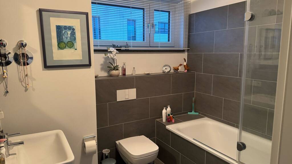 Das Badezimmer wurde modern und ansprechend gefliest und ist mit einer Badewanne ausgestattet. Ein Fenster sorgt für eine gute Belüftung und ausreichend Tageslicht, was den Raum zusätzlich erhellt und für eine angenehme Atmosphäre sorgt.