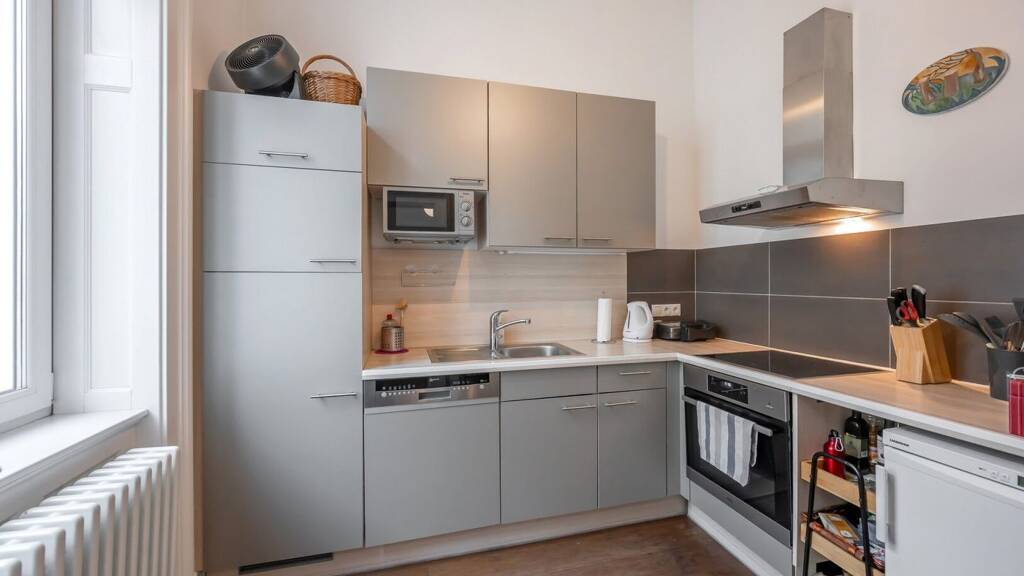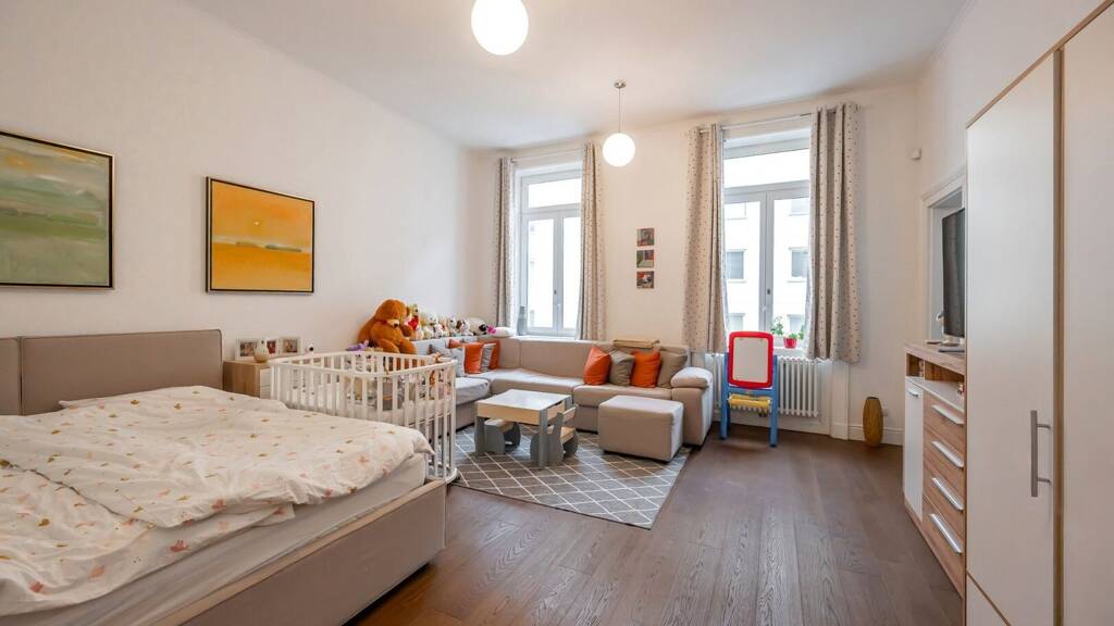 The quiet bedroom, facing the courtyard, features a private balcony. An additional large room (currently used as a children's room) can serve as a living room. From there, you access the separate kitchen (IKEA), which is included in the purchase price (except for the small refrigerator). The kitchen is fully equipped and has a window.