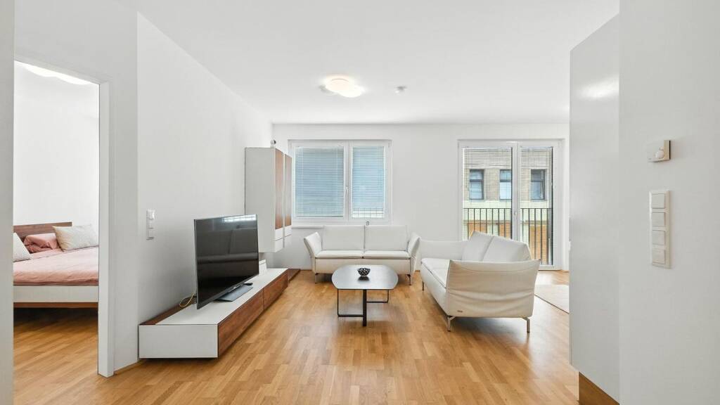 Neben dem Wohn- und Esszimmer verfügt die Wohnung über ein Schlafzimmer, Badezimmer und eine separate Toilette. In allen Wohnräumen ist qualitatives Parkett verlegt worden. Die Badausstattung ist zeitlos in weiß gehalten. Zusätzlich befindet sich ein edler Einbauschrank in der Wohnung. Die Wohnung liegt im ersten Liftstock, Sie können das Apartment somit barrierefrei und ohne Umwege mit dem Lift erreichen. Der Wohnung ist zudem ein Abteil im Keller zugewiesen.