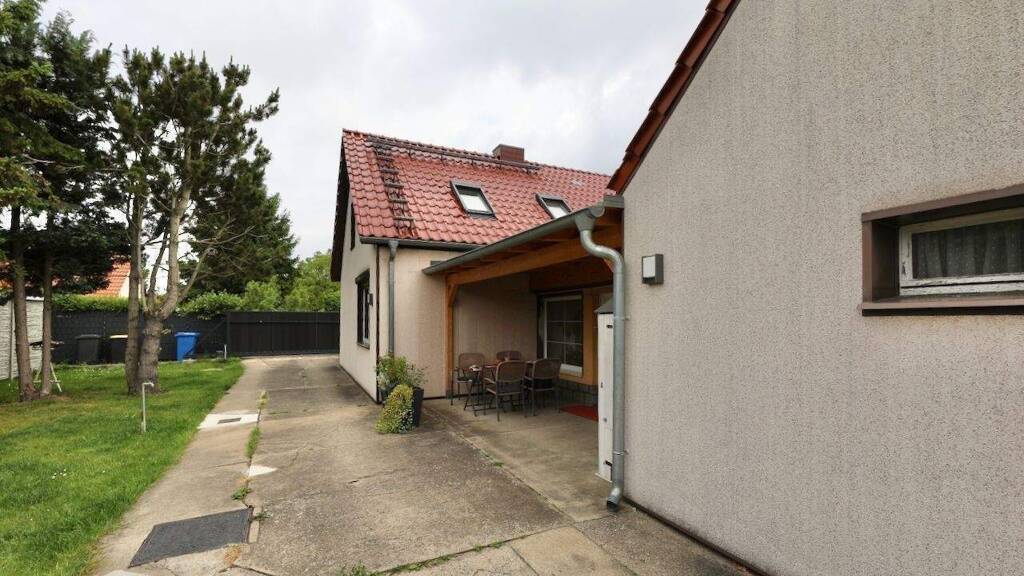 Das Haus befindet sich in einer ruhigen Straße, geprägt durch Einfamilienhäuser.