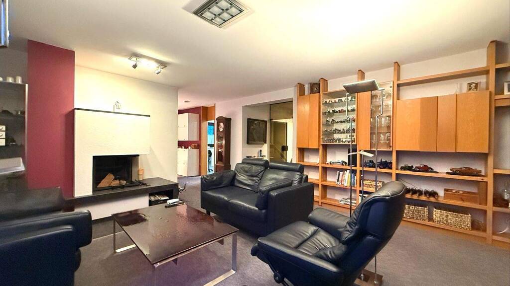 Zusätzlich bietet das Erdgeschoss einen großzügigen Wohnbereich mit offenem Kamin, der eine angenehme Wohnatmosphäre schafft. Die Küche ist offen gestaltet und an das Esszimmer angegliedert. Vom Esszimmer aus gelangt man direkt in den vollständig verglasten Wintergarten, der einen wunderbaren Blick in die Außenanlage bietet und den Wohnraum harmonisch erweitert.
