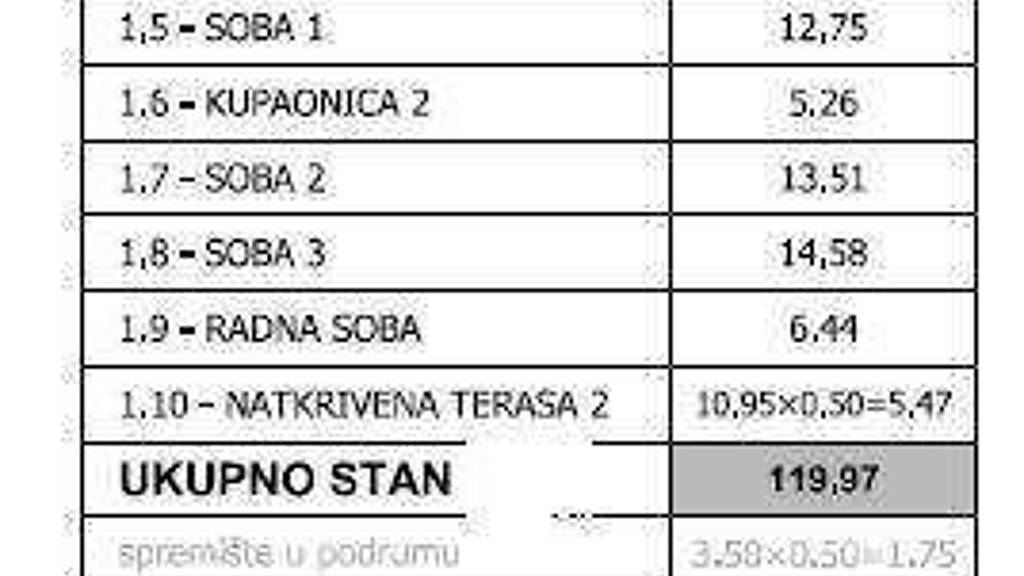 Die Wohnung mit einer Fläche von 119,97 m im 1. Stock besteht aus: Eingangsbereich, Wohnzimmer mit Küche und Essbereich, drei Schlafzimmern, zwei Badezimmern sowie zwei Terrassen. Zur Wohnung gehört außerdem ein Abstellraum im Keller des Gebäudes mit 3,50 m sowie zwei Außenstellplätze mit je 12,50 m.