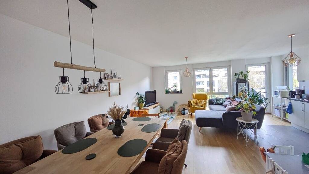 Der großzügige Wohn- und Essbereich mit Platz für eine Küche bildet das Herzstück der Wohnung. Ergänzt wird das Raumangebot durch ein Schlafzimmer, zwei weitere Zimmer, ein modernes Badezimmer mit Badewanne sowie ein separates Gäste-WC mit Dusche. Ein Abstellraum steht in der Wohnung ebenfalls zur Verfügung.