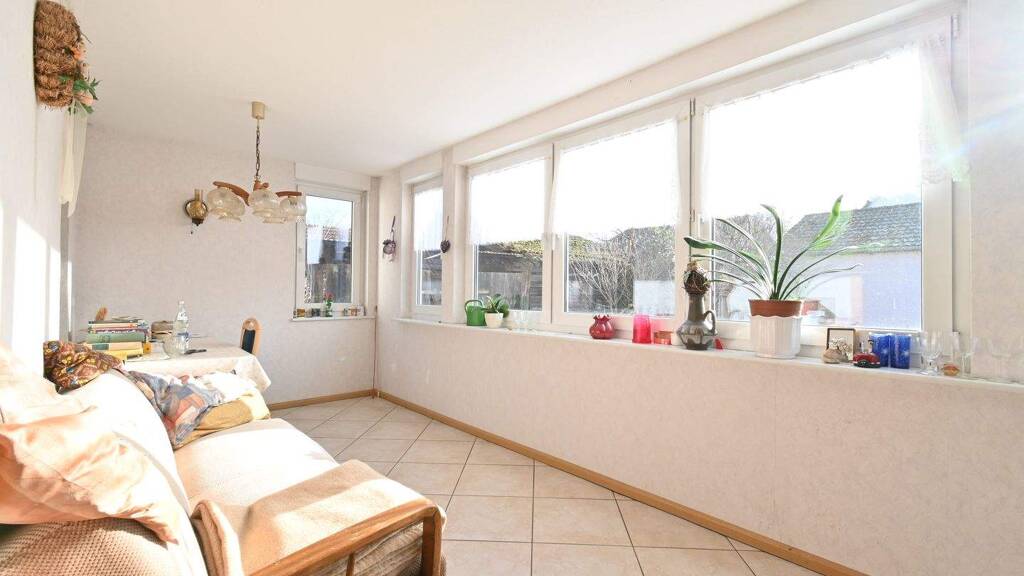 Im Erdgeschoss/Hochparterre erwarten Sie 4 Zimmer, darunter ein Wohnzimmer mit Erweiterung aus dem Jahr 2000 und teilweise elektrischen Rollläden, eine Wohnküche mit Zugang zum Garten und Platz für Waschmaschine und Trockner sowie ein Badezimmer mit einer behindertengerechten Dusche. Teilweise aus dem Jahr 2022 stammende Nachtspeicheröfen sorgen für wohlige Wärme.