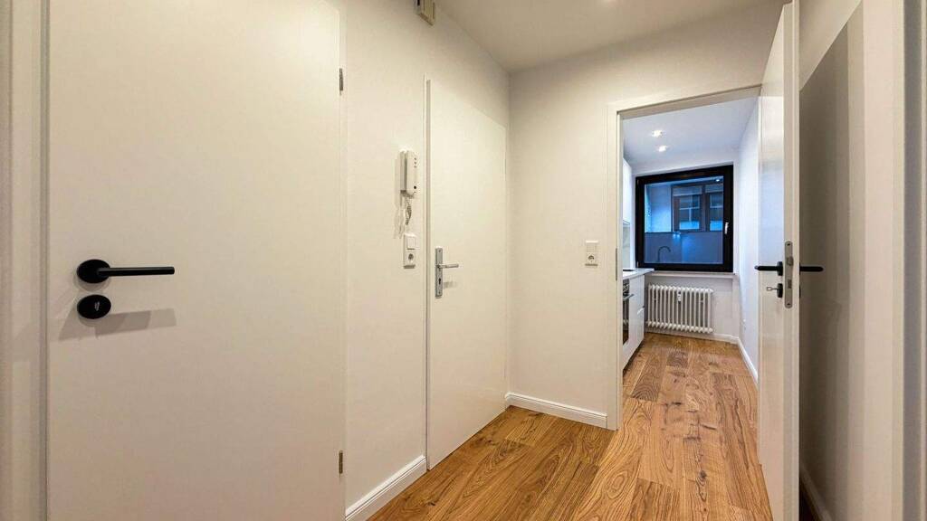 Beim Eintreten gelangt man in den zentralen Flur, von dem alle Räume erreichbar sind. Der durchgehend neu verlegte Parkettboden und glatt verspachtelte, frisch weiß gestrichene Wände verleihen der Wohnung ein klares, modernes Erscheinungsbild. Links befindet sich die Küche mit einer neuen Einbauküche samt elektrischen Geräten; ein in die Küche integrierter Waschmaschinenanschluss sorgt für kurze Wege im Alltag.