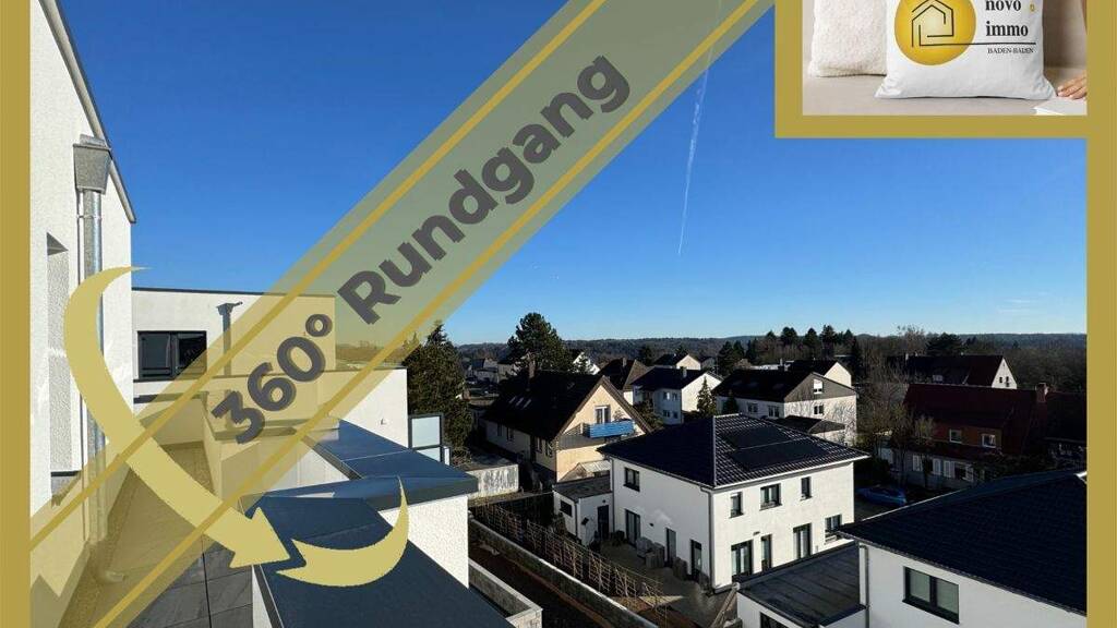 Ein moderner, offener Wohn-Essbereich mit Küche bietet einen direkten Zugang zur umlaufenden Dachterrasse. Zwei Schlafzimmer, davon eines mit Ankleidezimmer, eine Abstellkammer, ein Gäste-WC sowie das Tageslicht-Bad mit bodengleicher Wellness-Dusche und Badewanne runden die Wohlfühl-Atmosphäre dieser Wohnung ab.