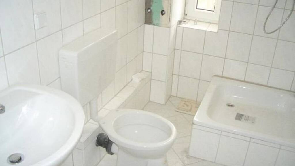 Die Wohnung ist ausgestattet mit einem gefliesten Duschbad , WC , Küche mit gefliestem Boden und Küchenspiegel. Die Küche ist ohne Inventar vermietet.