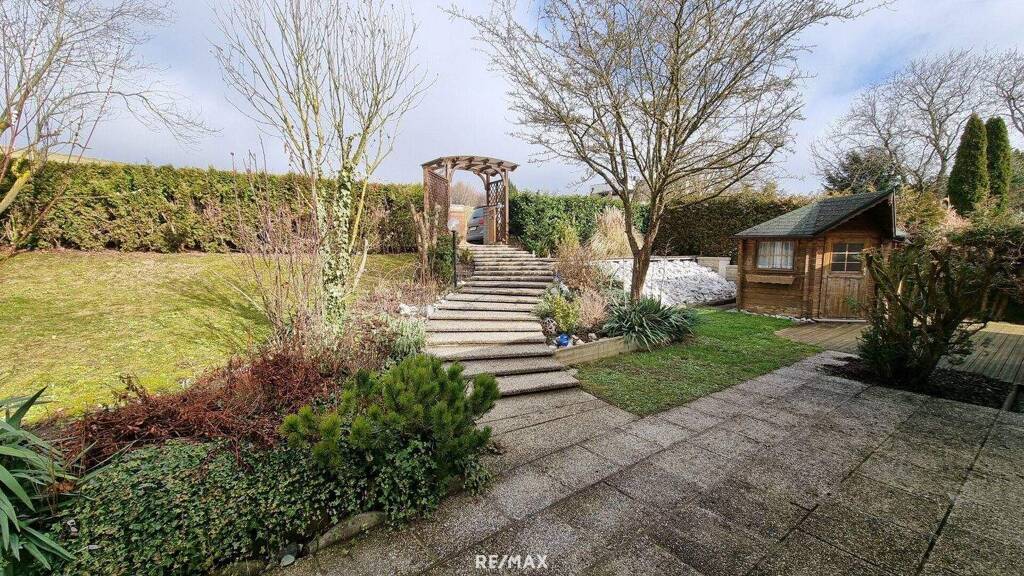 Eine Doppelgarage bietet komfortable Parkmöglichkeiten für zwei Fahrzeuge. Der gepflegte Garten rundet das Gesamtbild ab und schafft eine grüne Oase für die ganze Familie.