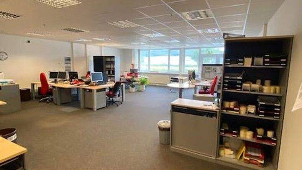 Die Gesamtfläche teilt sich in ungefähr 650 qm Bürofläche und in ungefähr 450 qm Freifläche auf.