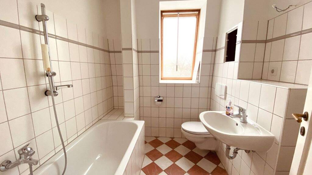 Das Badezimmer ist klassisch gefliest und funktional ausgestattet. Die Kombination aus Wanne und Fenster bietet sowohl Komfort als auch praktischen Nutzen im Alltag.