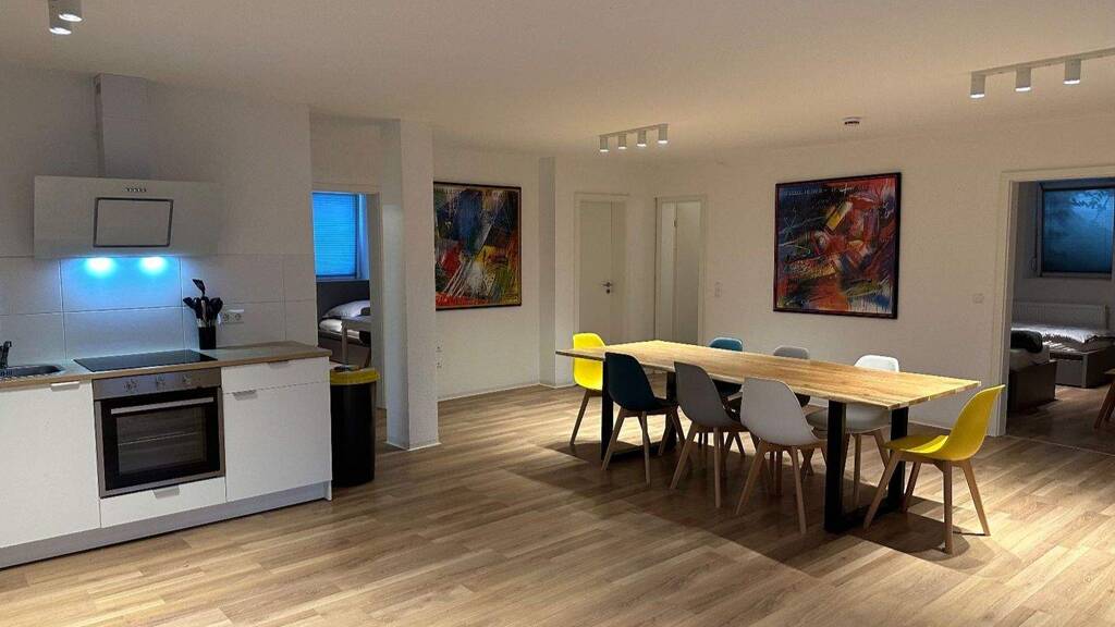 Frisch renoviert und möbliert im Februar 2022. Große möblierte und voll ausgestattete 5-Zimmerwohnung. Es gibt 5 Schlafzimmer mit Einzelbetten, dazu noch einen modernen Wohn-Essbereich mit offener Küche mit einem großen Esstisch und TV. Sie können hier bis zu 10 Personen unterbringen. Internet (Wlan) ist kostenlos vorhanden.