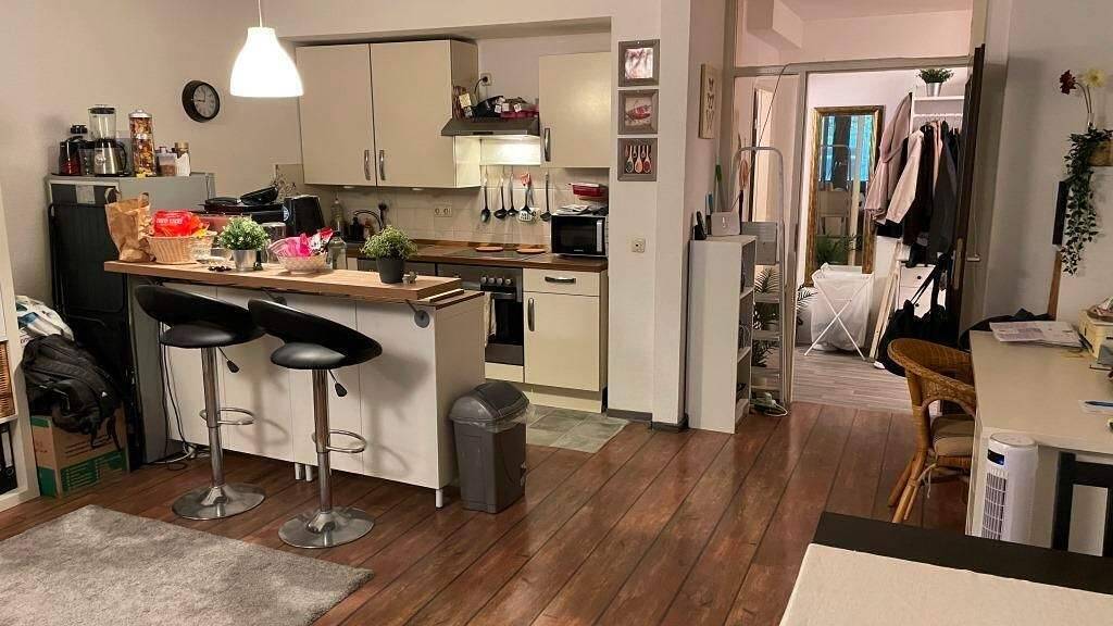 Die Wohnung befindet sich im 3. Obergeschoss des Hauses. Die Wohneinheit ist als 1-Zimmer-Wohnung mit offener Küche, Diele und Wannenbad ausgerichtet. Beim Betreten der Wohnung empfängt Sie eine gut geschnittene Diele, in der sich rechter Hand ein praktischer großer Einbauschrank befindet, der Ihnen Stauraum bietet. Über den Flur gelangen Sie in den großzügigen Wohnraum mit offener Küchenzeile. Der Wohnraum ist mit einem Laminatboden ausgestattet. Des Weiteren verfügt diese Wohnung über ein gefliestes Duschbad mit Waschmaschinenanschluss. Die Wohnung befindet sich in einem unrenovierten Zustand. Ein separater Kellerraum gehört ebenfalls zur Wohnung.